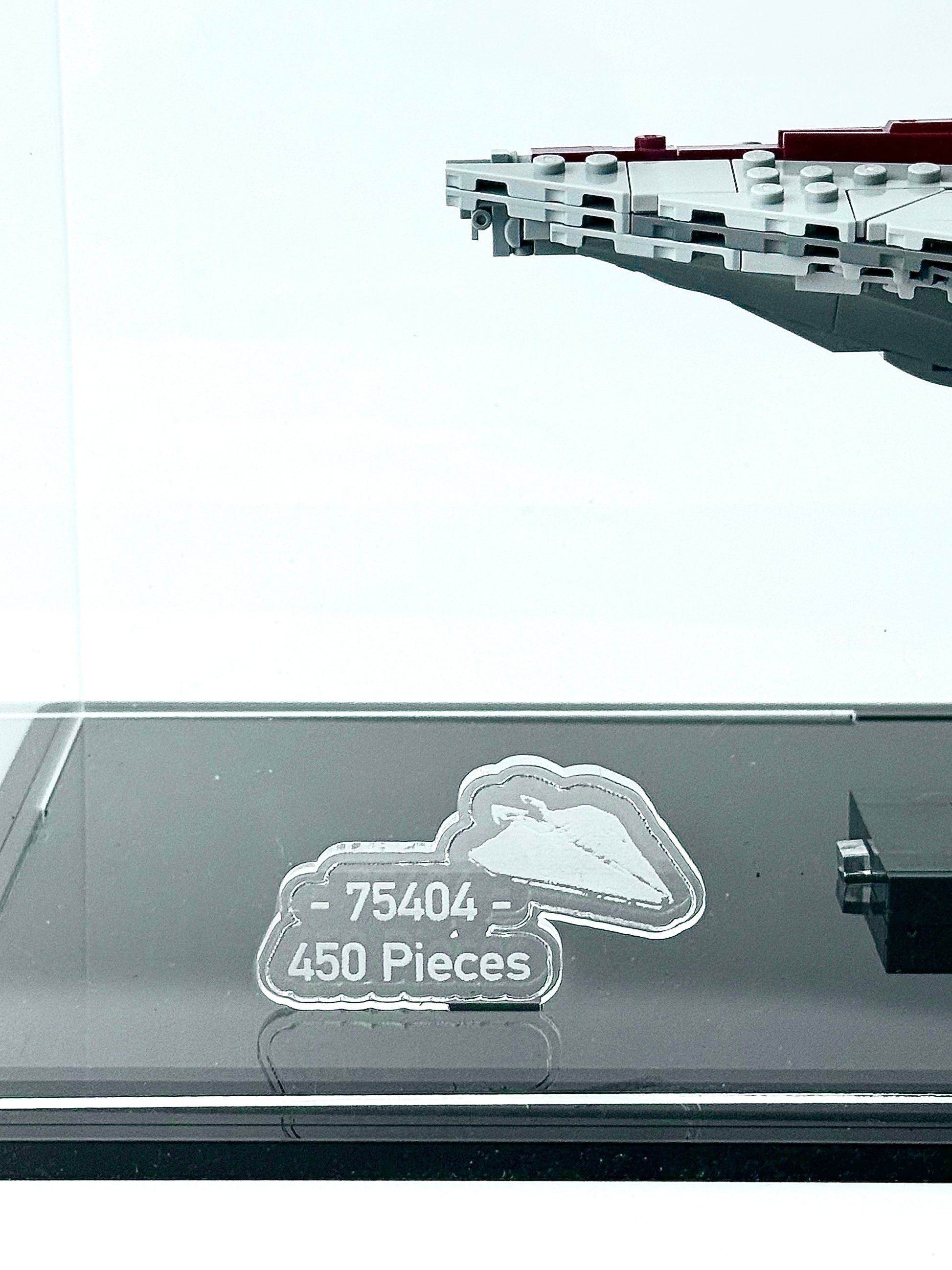 We’ve engineered this case from clear cast acrylic panels and a black acrylic base for maximum stability and visual impact. A laser-engraved descriptive plate featuring the set number and name adds that polished collector’s touch. The inner floor is designed to securely hold the Acclamator in flight-pose.