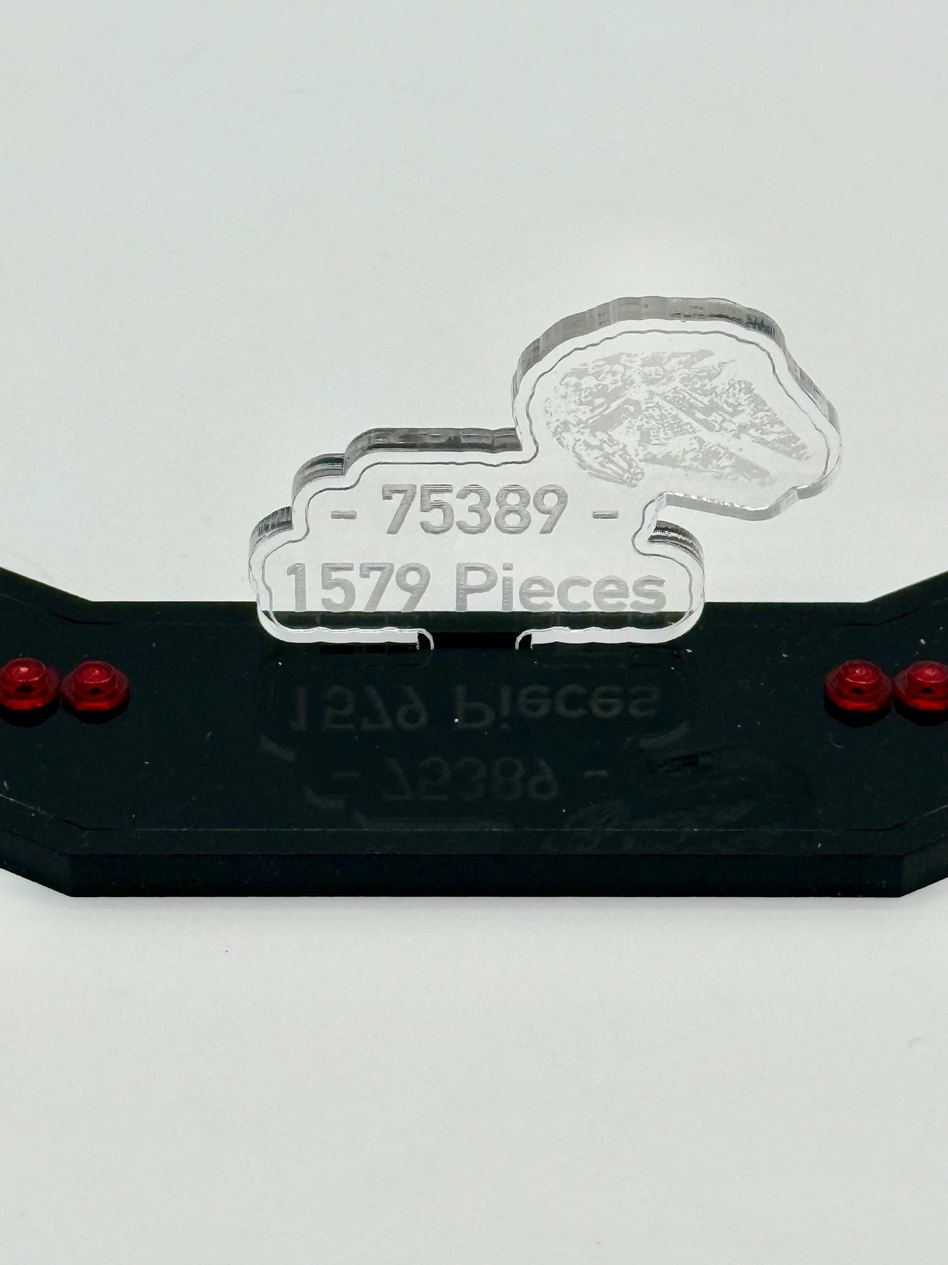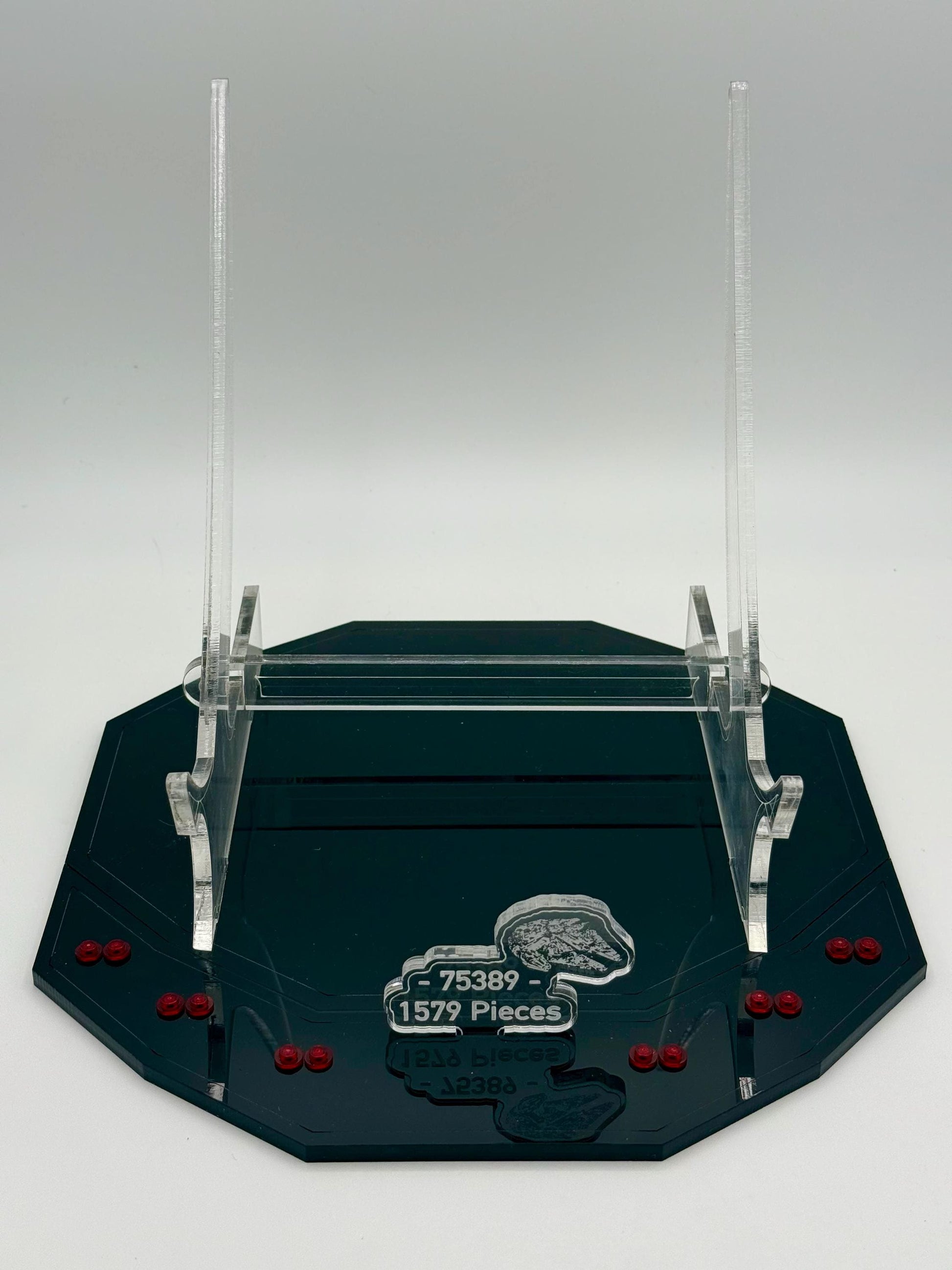 This is our stand designed specifically for LEGO® Star Wars Dark Falcon set 75389. Are you looking for a way to display this awesome ship and it's incredible assortment of unique minifigures? This is it! Our stand is constructed from durable cast acrylic. We use .220 inch (5.58 mm) acrylic to ensure proper support and stability in both the base and the supports. This stand also has a descriptive plate to display the set number and piece count as well as studs built in to display these incredible minifigures. The minifigure plate slides perfectly into place at the base of the stand but can also be displayed adjacent if space does not permit.