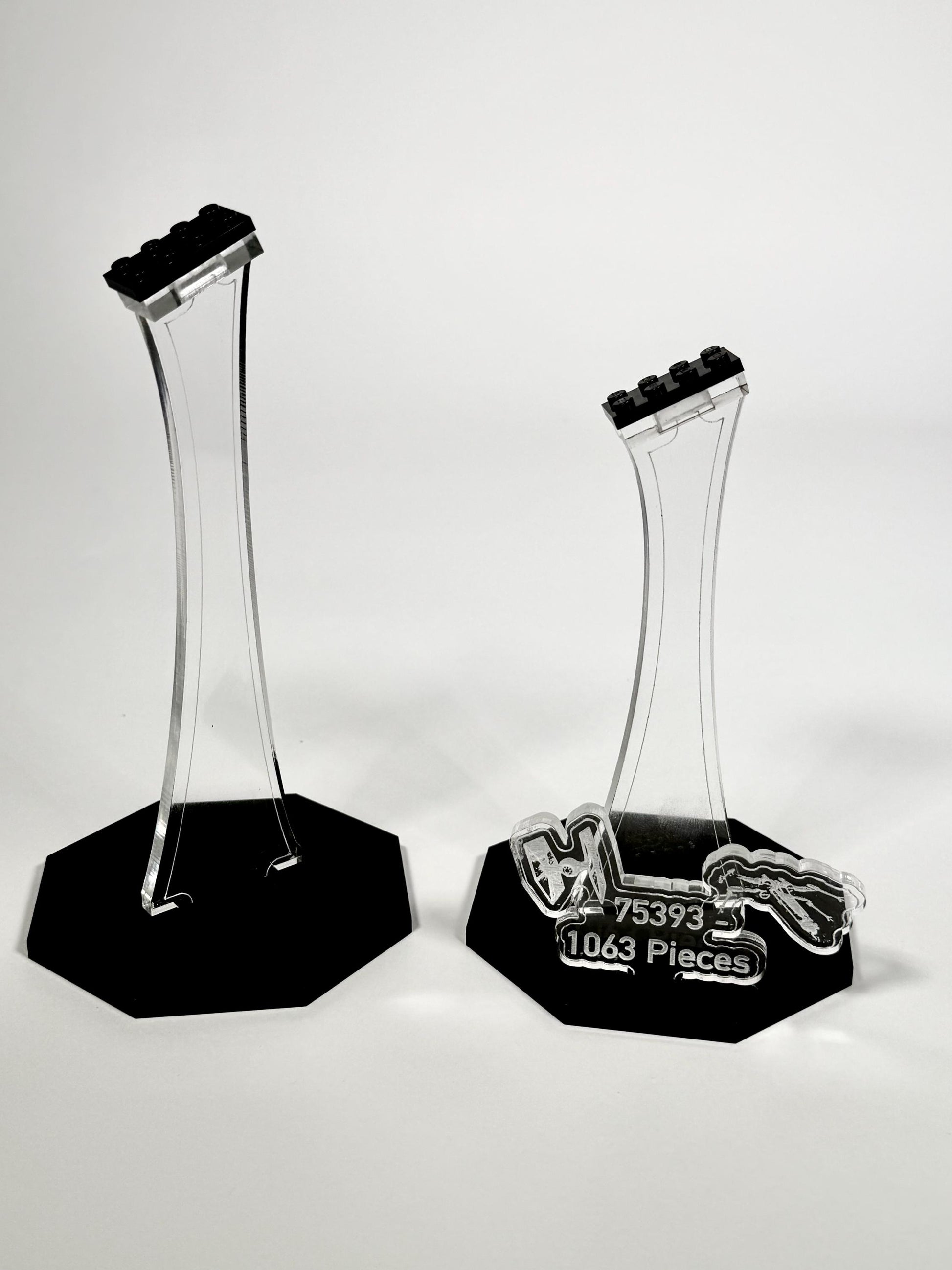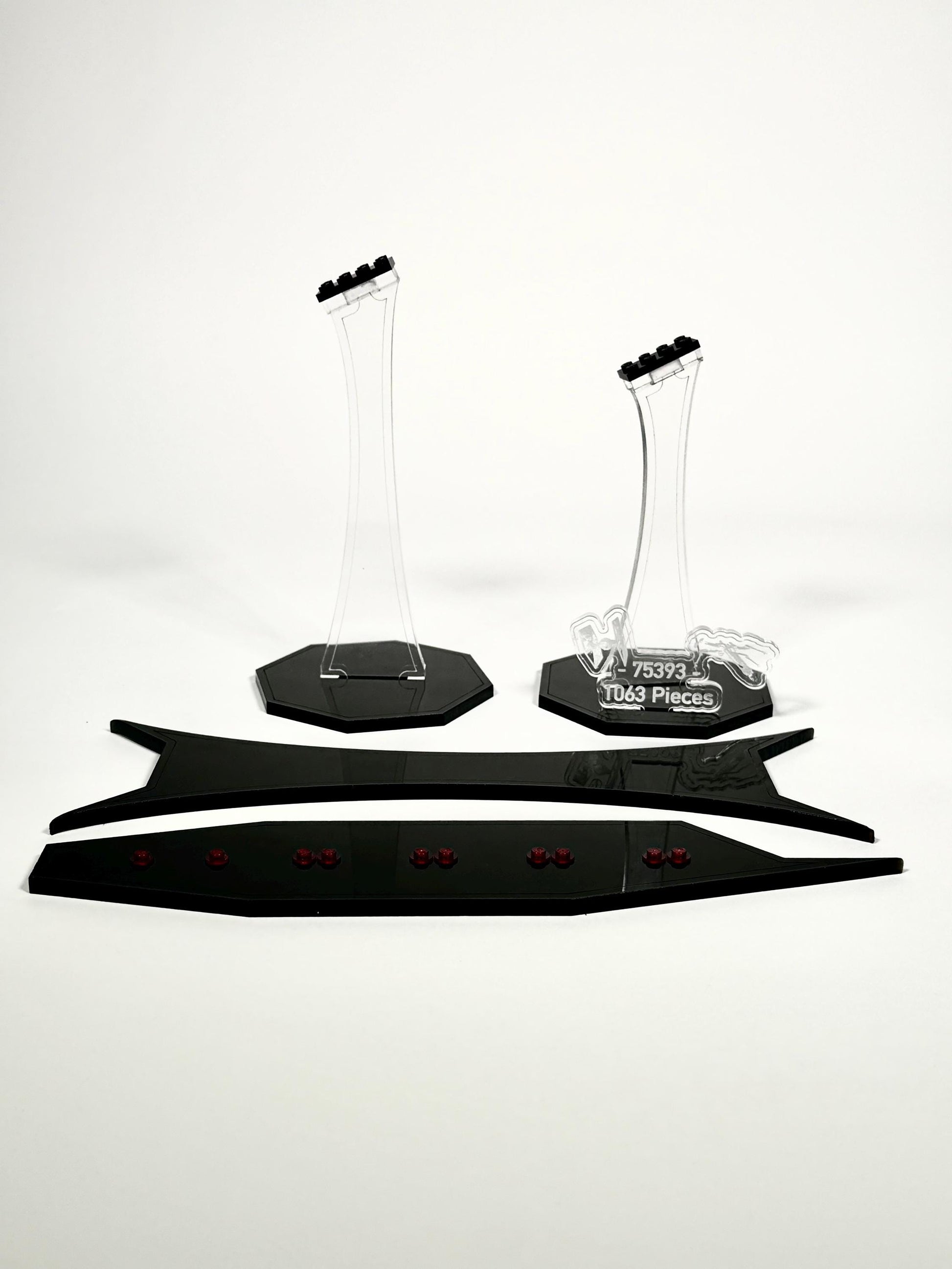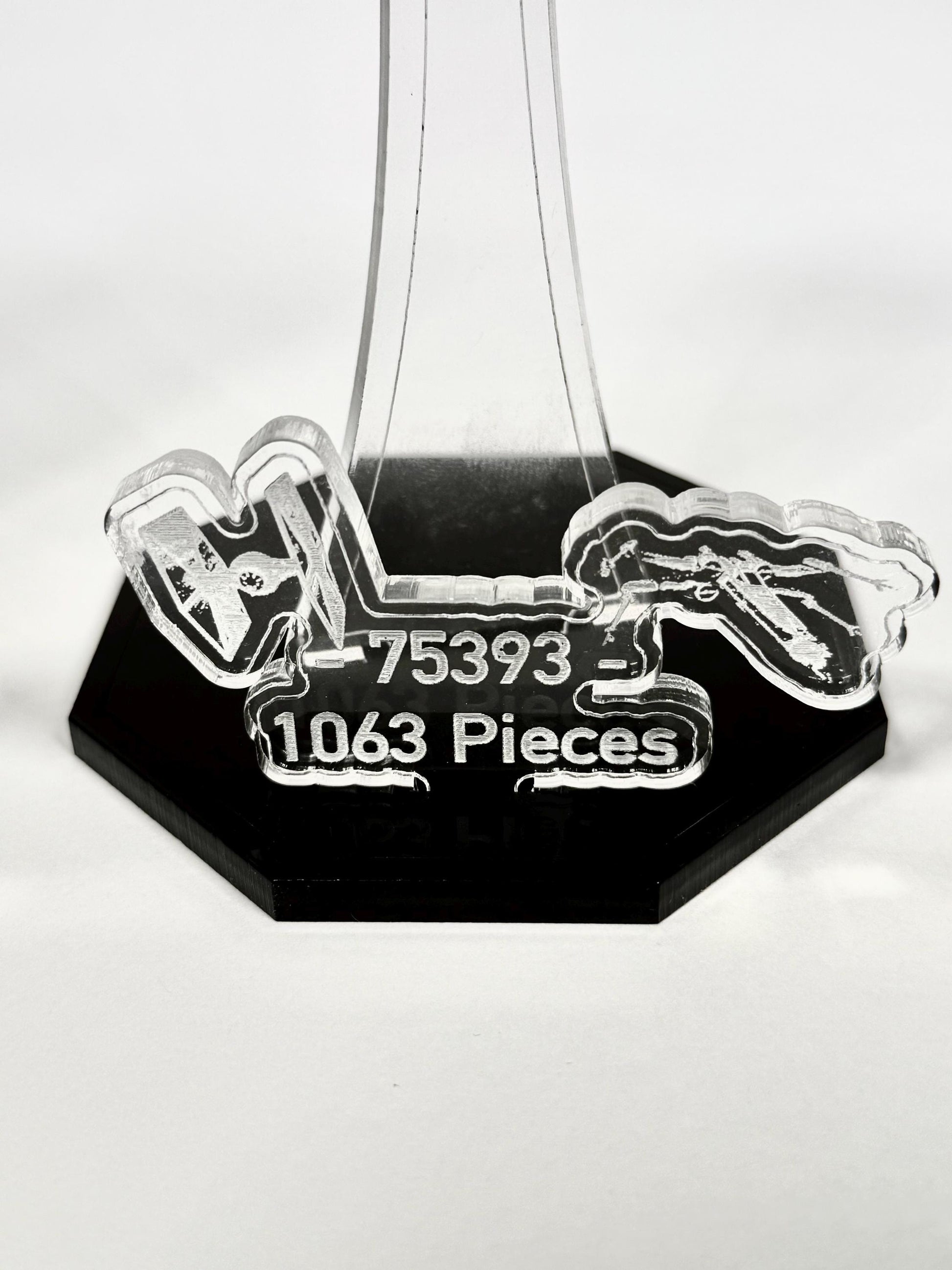 What if your LEGO TIE Fighter and X-Wing Mash-up Set didn’t just sit on a shelf—what if it flew? Our custom-designed stand for Set 75393 turns your mash-up masterpiece into a centerpiece. This is our stand designed specifically for LEGO® TIE Fighter & X-Wing Mash-up Set 75393. Our stand is constructed from durable cast acrylic. We use .220 inch (5.58 mm) acrylic to ensure proper support and stability in both the base and the supports. This stand also has a descriptive plate to display the set number and piece count as well as studs built in to display these unique minifigures. The stand contains 4 individual base plates that can be joined to create a beautiful stand or displayed individually based on your setup.
