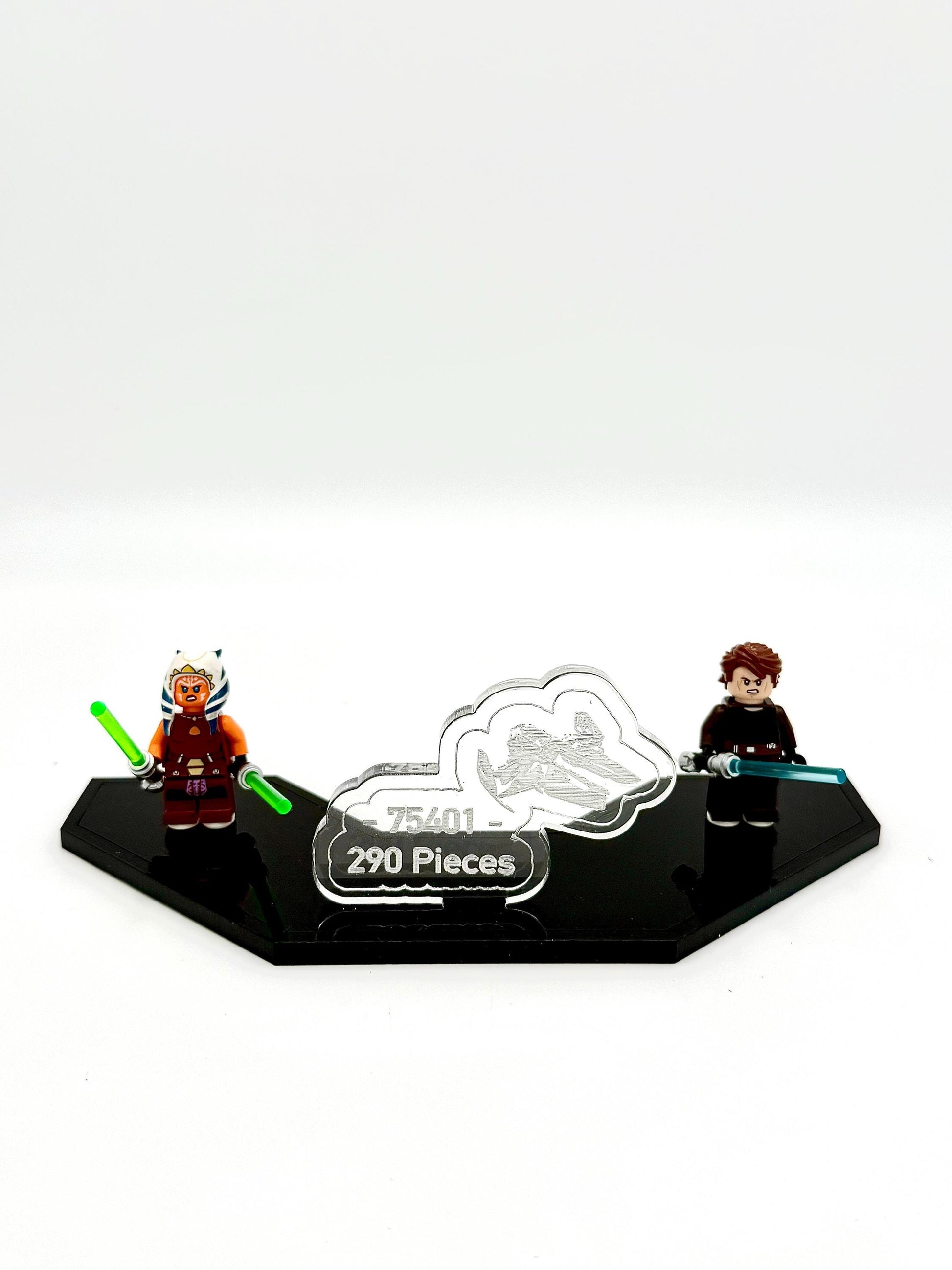 This is our stand designed specifically for LEGO® set 75401 Ahsoka’s Jedi Interceptor. It’s the perfect way to showcase this iconic starfighter. The stand features a custom-mounted cradle for the ship, as well as a dedicated display area for the set’s minifigures — Anakin Skywalker and Ahsoka Tano.