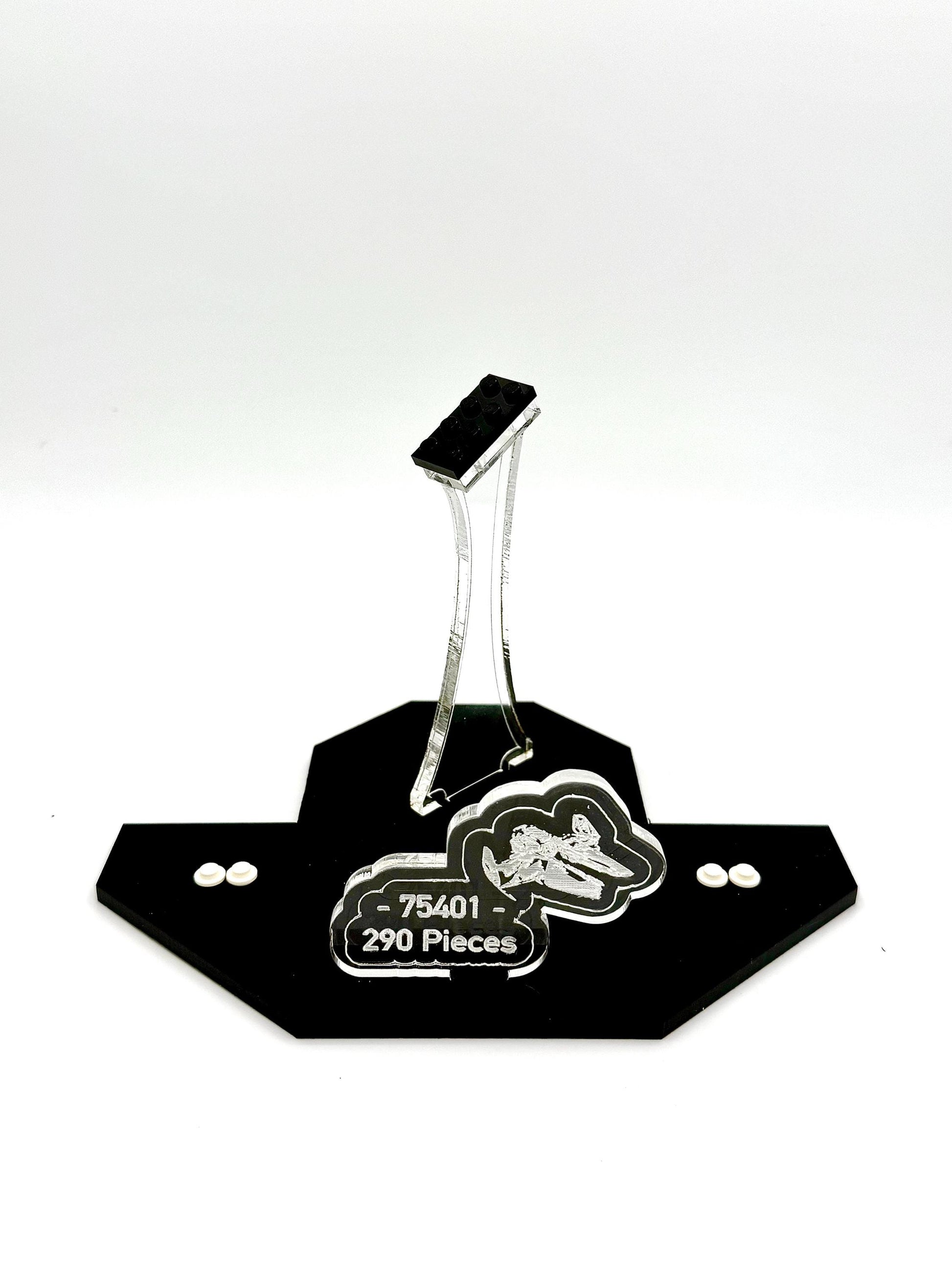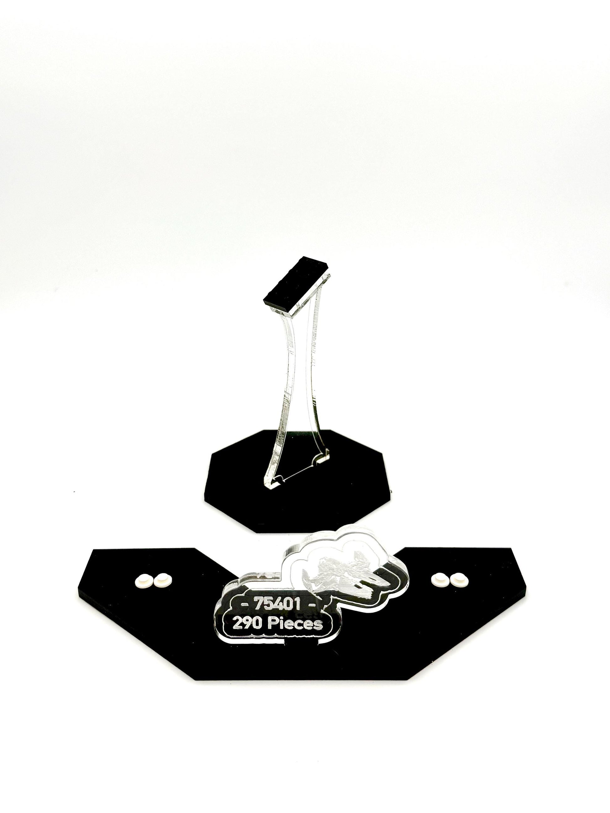 Our stand is constructed from durable cast acrylic using .220 inch (5.58 mm) material to ensure superior support and stability in both the base and vertical supports. We also use real LEGO® studs and baseplates for attaching the ship and figures. It includes a descriptive plate detailing the set number and piece count, and integrated studs to securely display the minifigures. The minifigure plate fits snugly at the front of the base but can also be positioned separately to fit your display space.