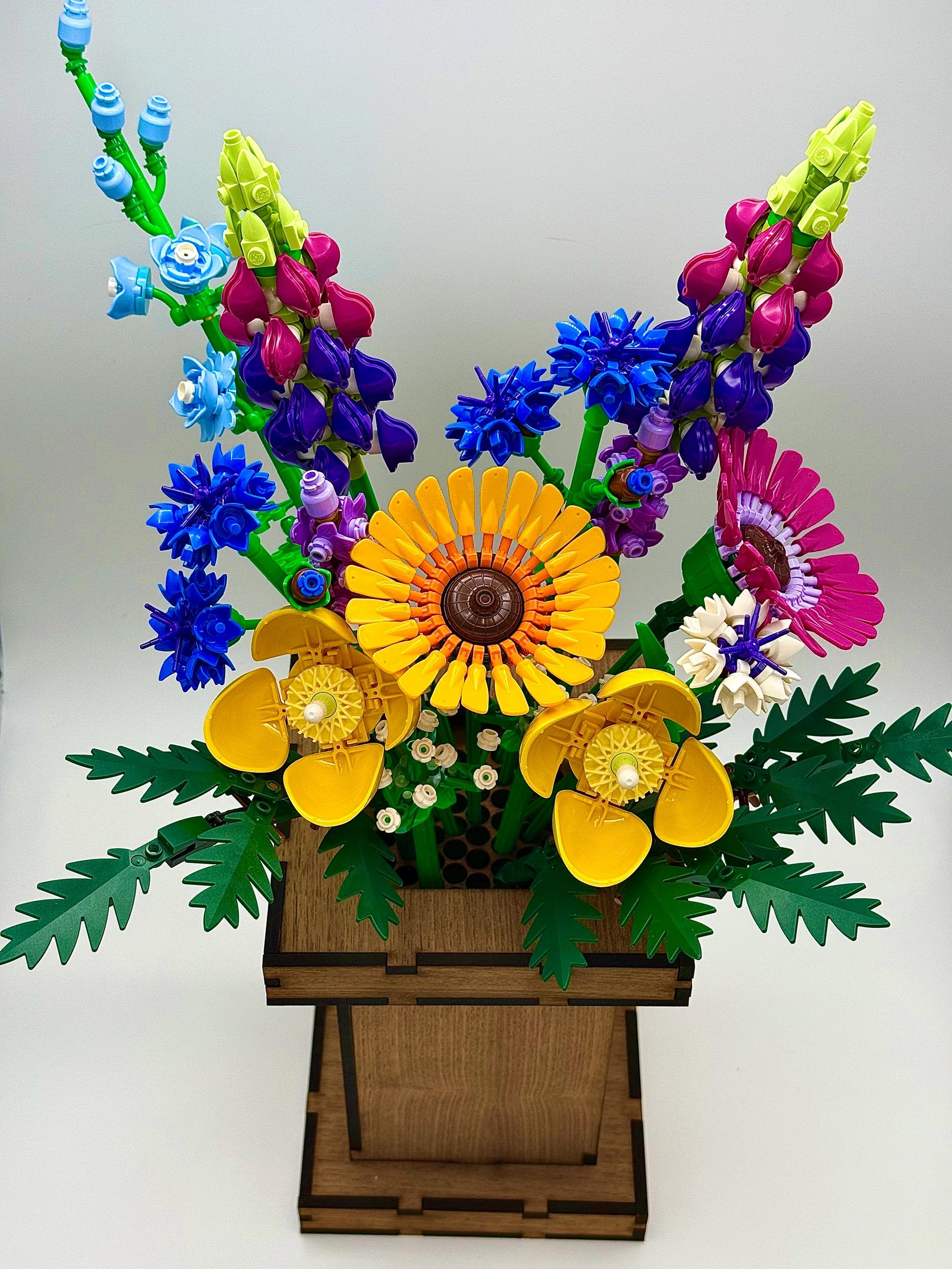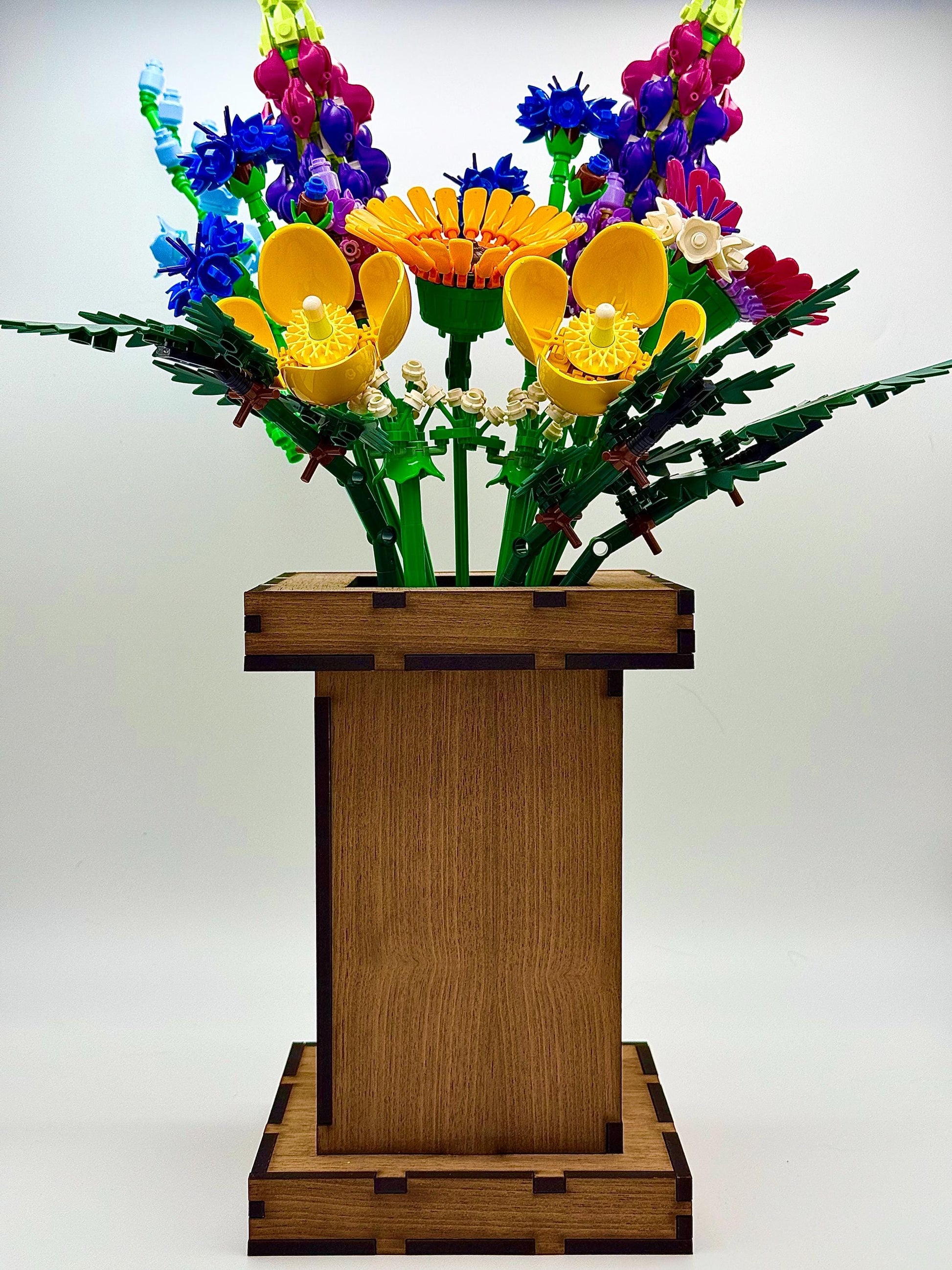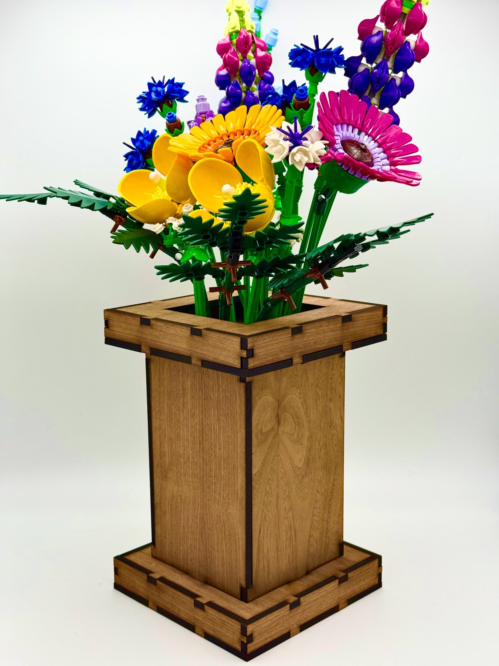 This is our Walnut Vase that is designed for Lego Botanicals bouquets, specifically this vase is displaying Lego botanicals Set 10313 Wildflower Bouquet. The base dimensions are 5.5" x 5.5" and stands 8.5" tall. It has individual holes for easy display and organization. Use your creativity to customize your design using the provided display holes. It comes in two variations, plain walnut veneer and walnut veneer with etching. This is a great addition for your Botanicals set and allows you to easily display the bouquets. The Lego set is not included. Assembly is quick and easy.
