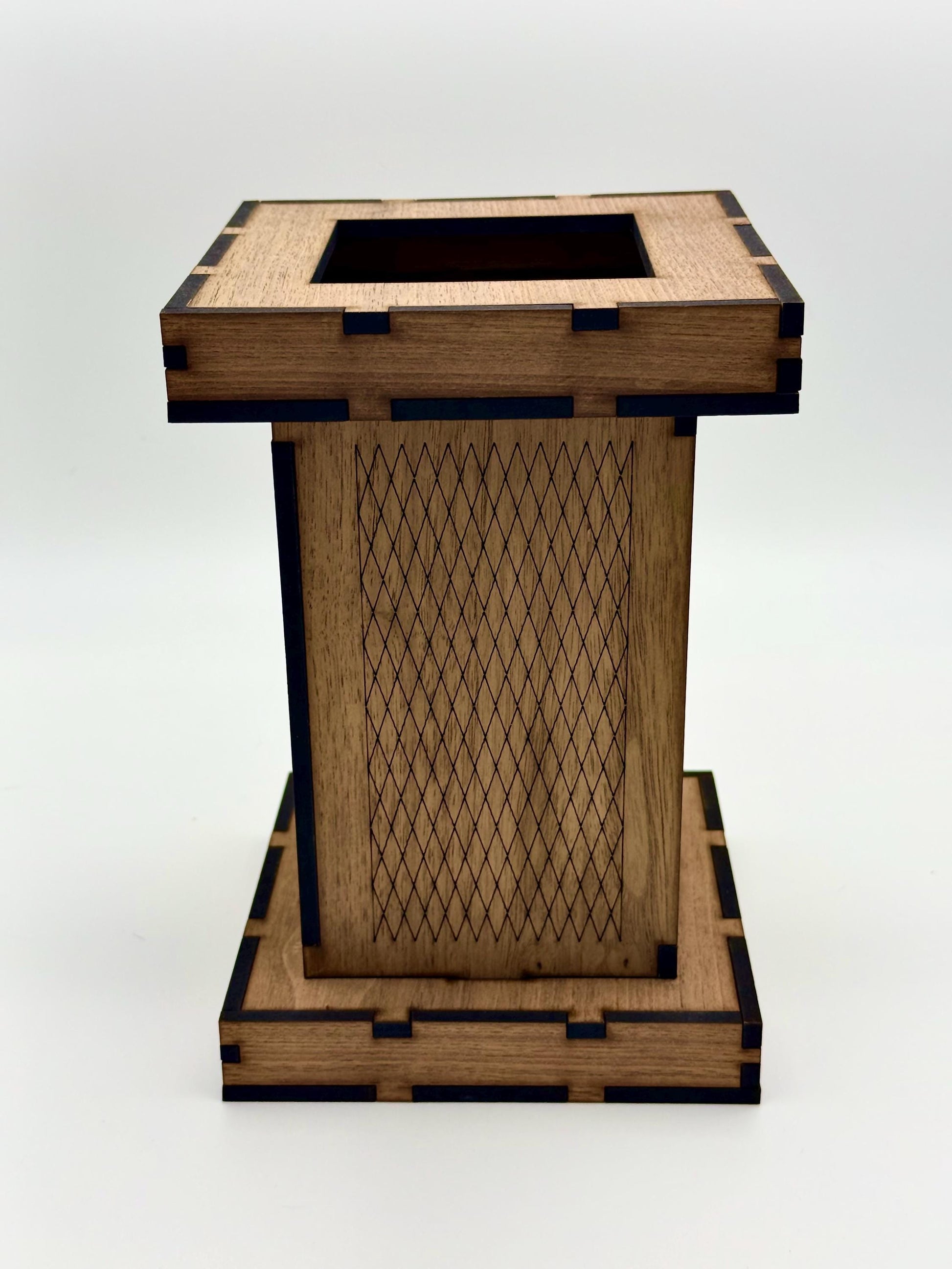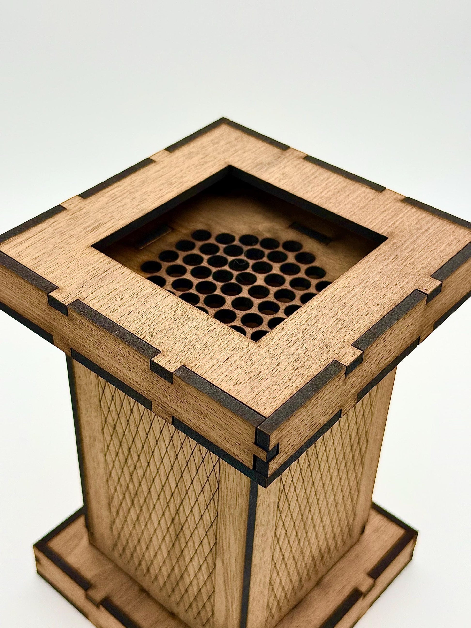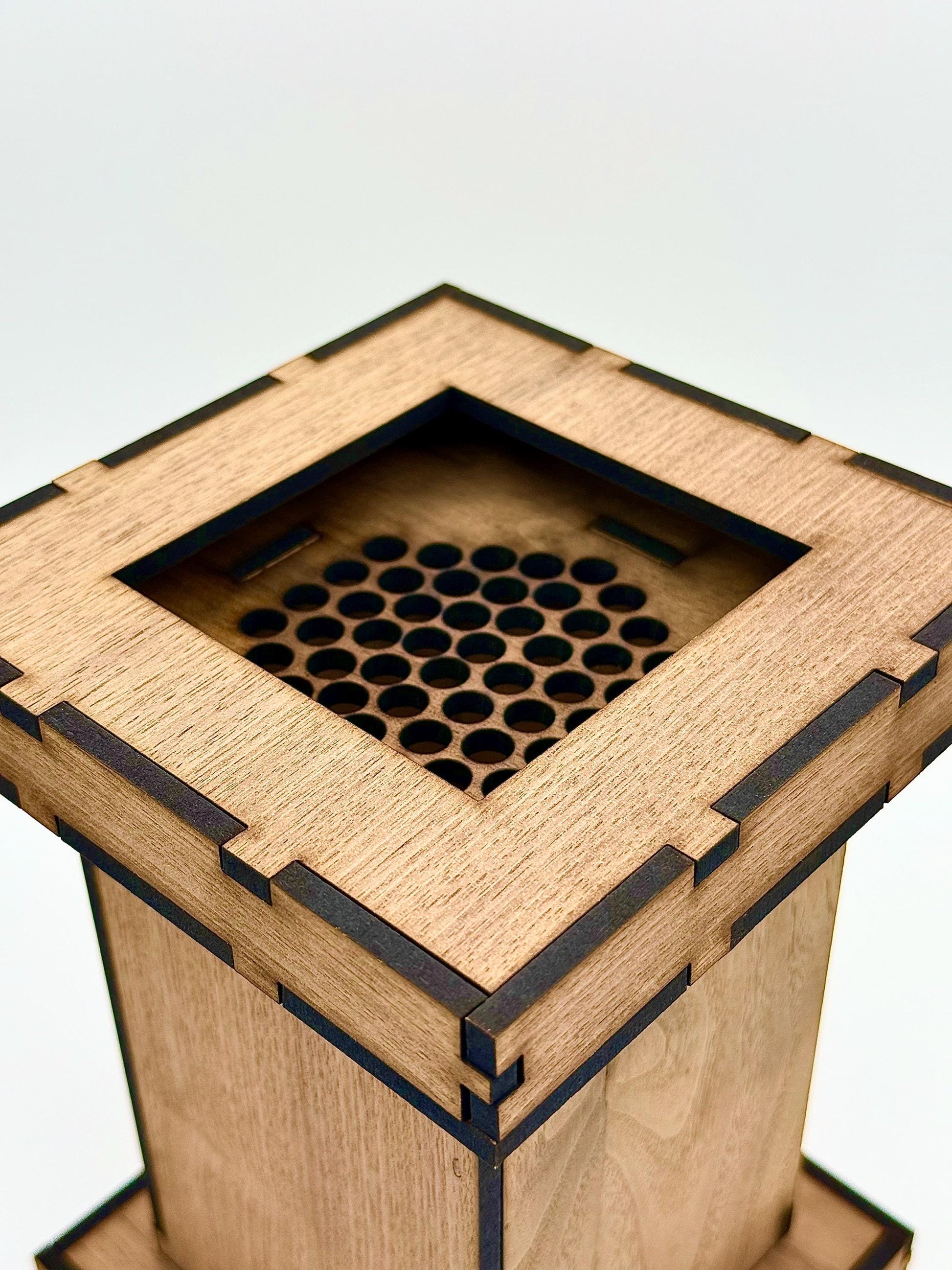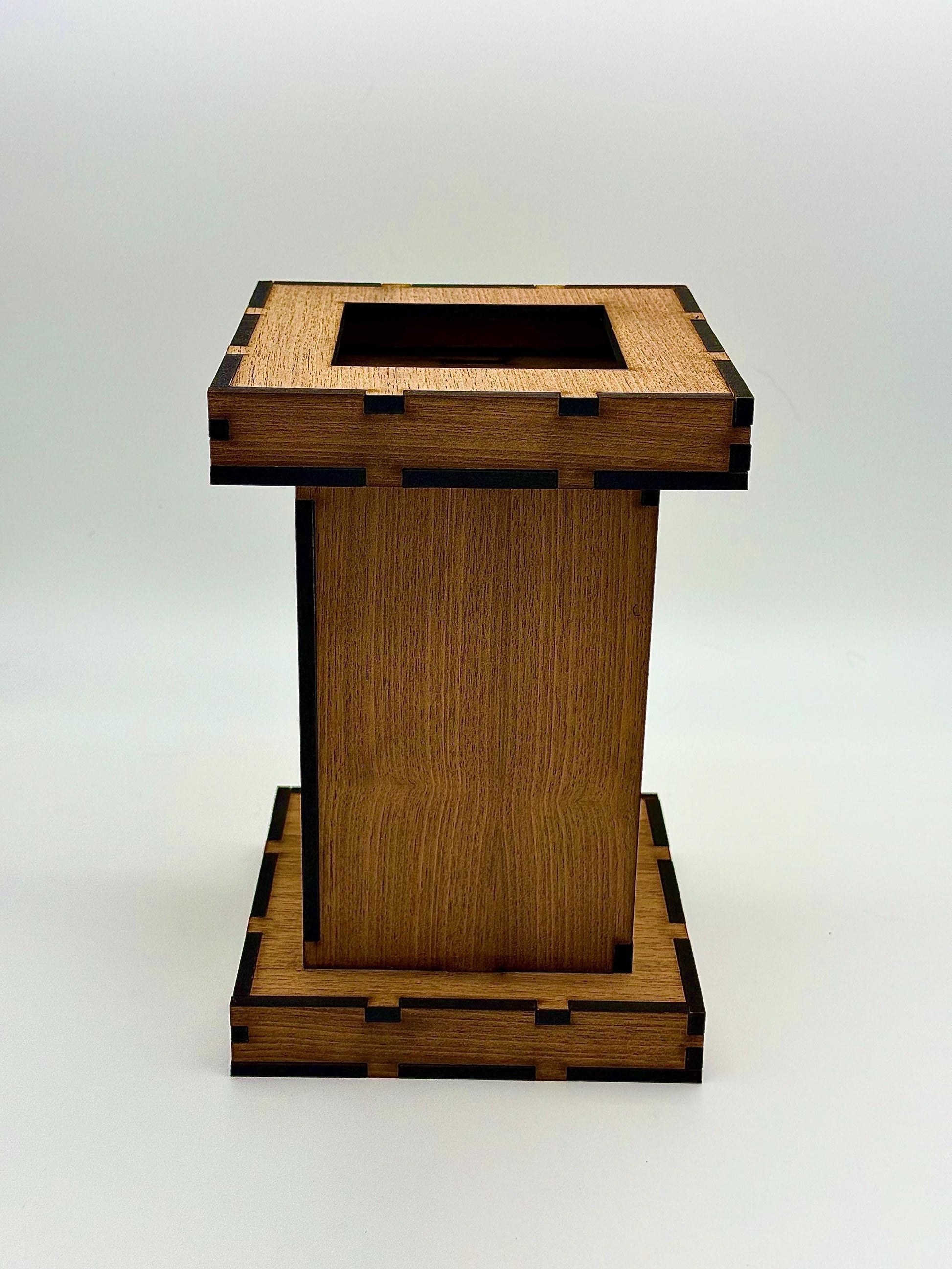This is our Walnut Vase that is designed for Lego Botanicals bouquets, specifically this vase is displaying Lego botanicals Set 10313 Wildflower Bouquet. The base dimensions are 5.5" x 5.5" and stands 8.5" tall. It has individual holes for easy display and organization. Use your creativity to customize your design using the provided display holes. It comes in two variations, plain walnut veneer and walnut veneer with etching. This is a great addition for your Botanicals set and allows you to easily display the bouquets. The Lego set is not included. Assembly is quick and easy.